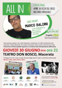 Giovedì 30 giugno 2016, presso il Teatro Don Bosco di Macerata, alle ore 21 va in scena la serata finale del Progetto ALL IN, che in un anno e mezzo ha realizzato più di 100 incontri nel territorio dedicati alla prevenzione del gioco d’azzardo patologico. 8 mila studenti raggiunti nelle scuole, un numero comparabile di cittadini […]