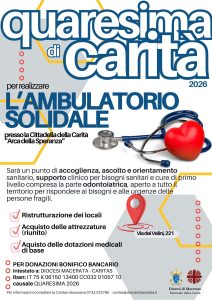 La Quaresima di Carità 2026 sarà dedicata a un progetto concreto di solidarietà: il completamento dell’Ambulatorio solidale che nascerà all’interno della Cittadella della Carità “L’Arca della Speranza”. L’iniziativa nasce dal desiderio di offrire una risposta reale ai bisogni sanitari che emergono con sempre maggiore frequenza tra le persone più fragili, spesso costrette ad affrontare difficoltà […]