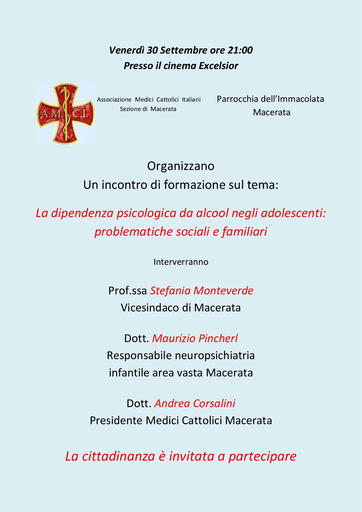 I medici cattolici organizzano per venerdì 30 settembre 2016, alle ore 21:00, un incontro di formazione sul tema: LA DIPENDENZA SPICOLOGICA DA ALCOOL NEL ADOLESCENTI: PROBLEMATICHE SOCIALI E FAMILIARI.