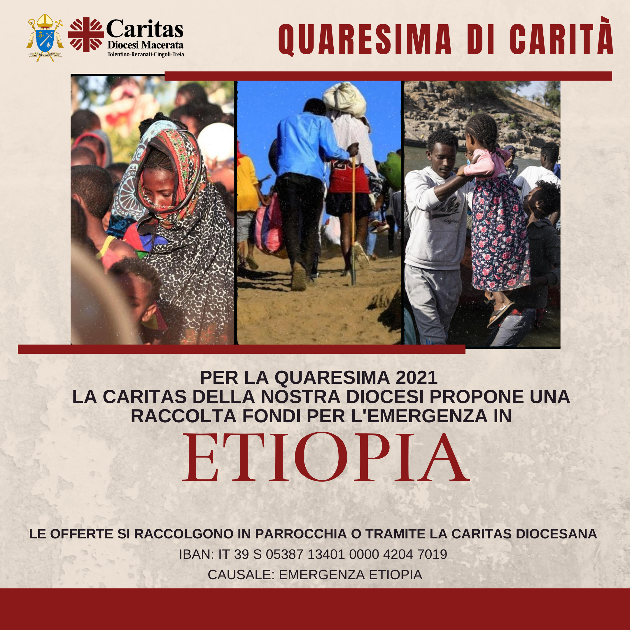 Per la Quaresima 2021 la Diocesi propone una raccolta fondi per una solidarietà concreta in aiuto alle popolazioni vittime del conflitto in Etiopia contribuendo al sostegno delle iniziative della rete Caritas e di unirci agli appelli della chiesa locale e del Santo Padre affinché cessino le violenze, siano tutelati i civili, sia garantito l’accesso agli aiuti, si torni al dialogo e le popolazioni possano ritrovare la pace.